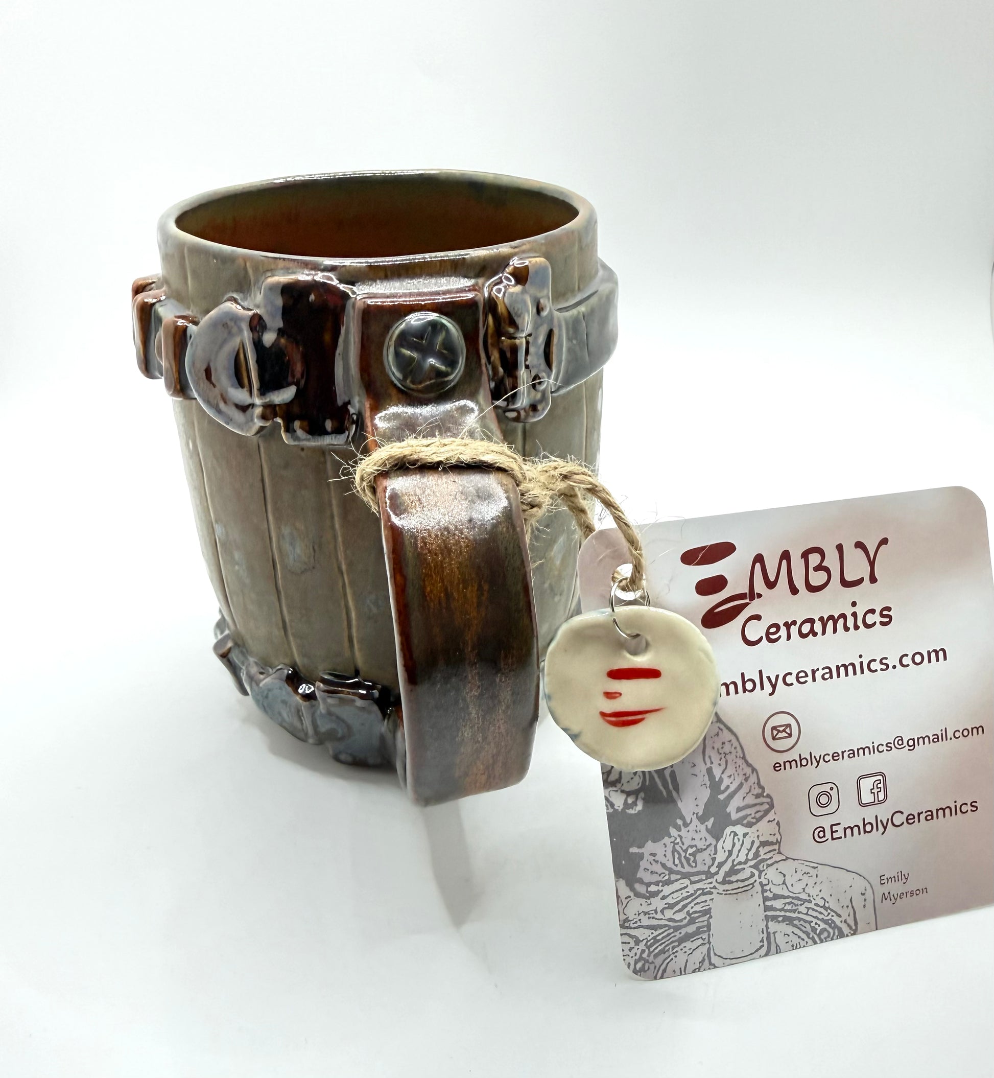 Wheel thrown mug, hand-carved & adorned with hand-built pieces. Mug is 100% ceramic stoneware. Bottoms have been smoothed to reduce any possible table scratching.